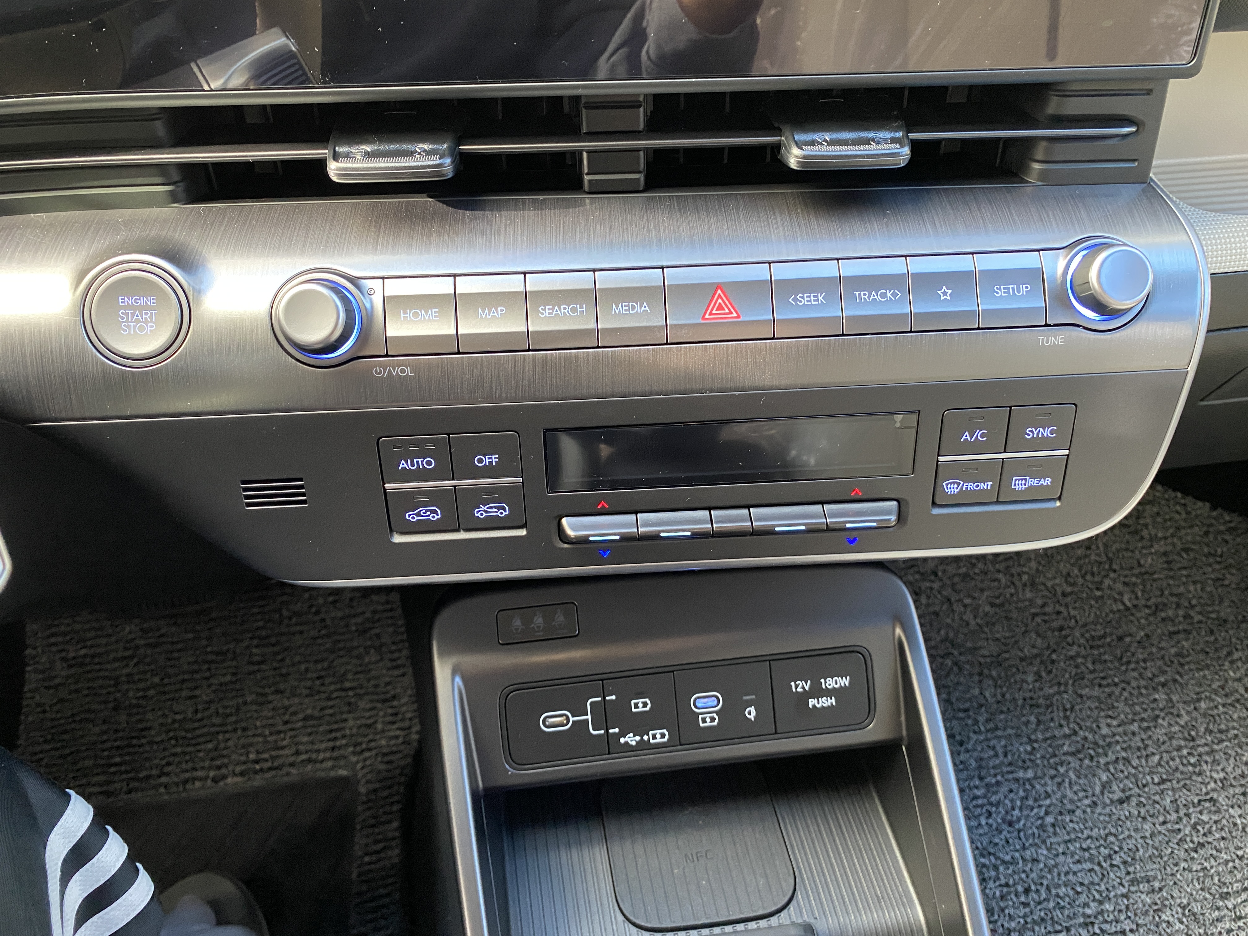 시동 스위치와 오디오 관련 버튼이 있고 그 아래로 에어컨 조작부가 있으며 더 아래쪽으로 내려가보면 충전 단자가 있습니다.