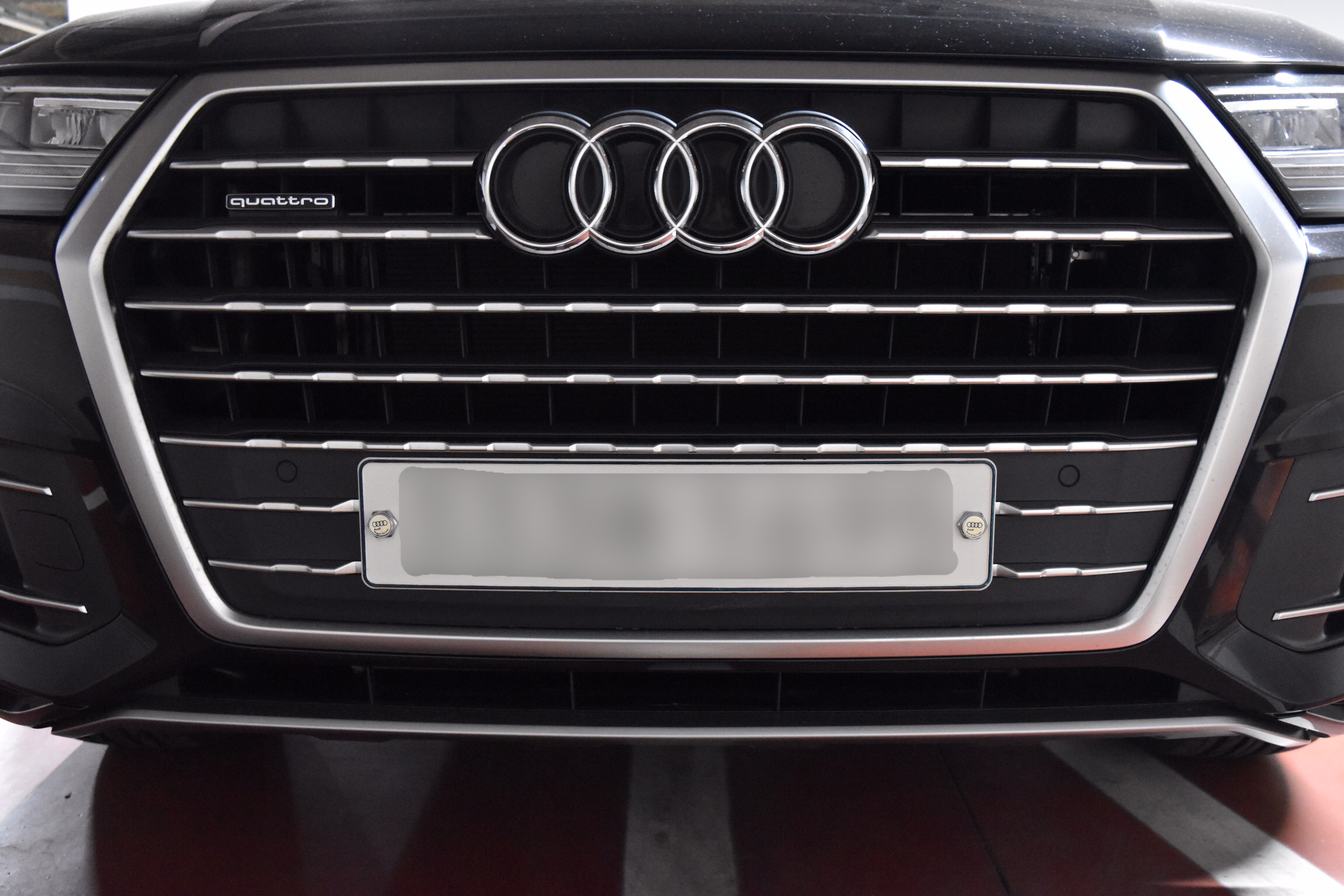 육각형 형태의 거대한 그릴 안쪽에는 번호판, 아우디 로고, 그리고 작은 콰트로 로고가 자리잡고 있습니다.