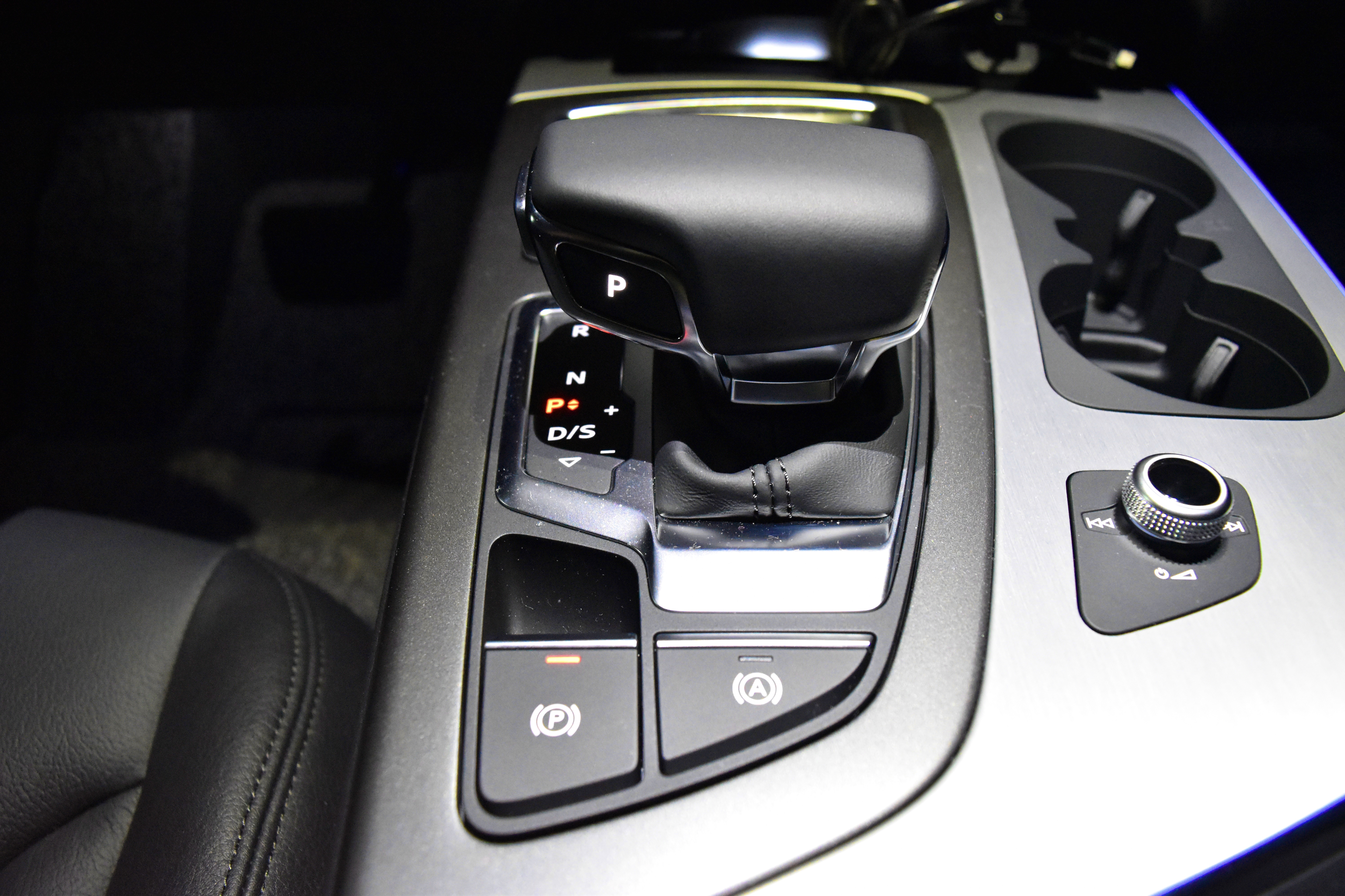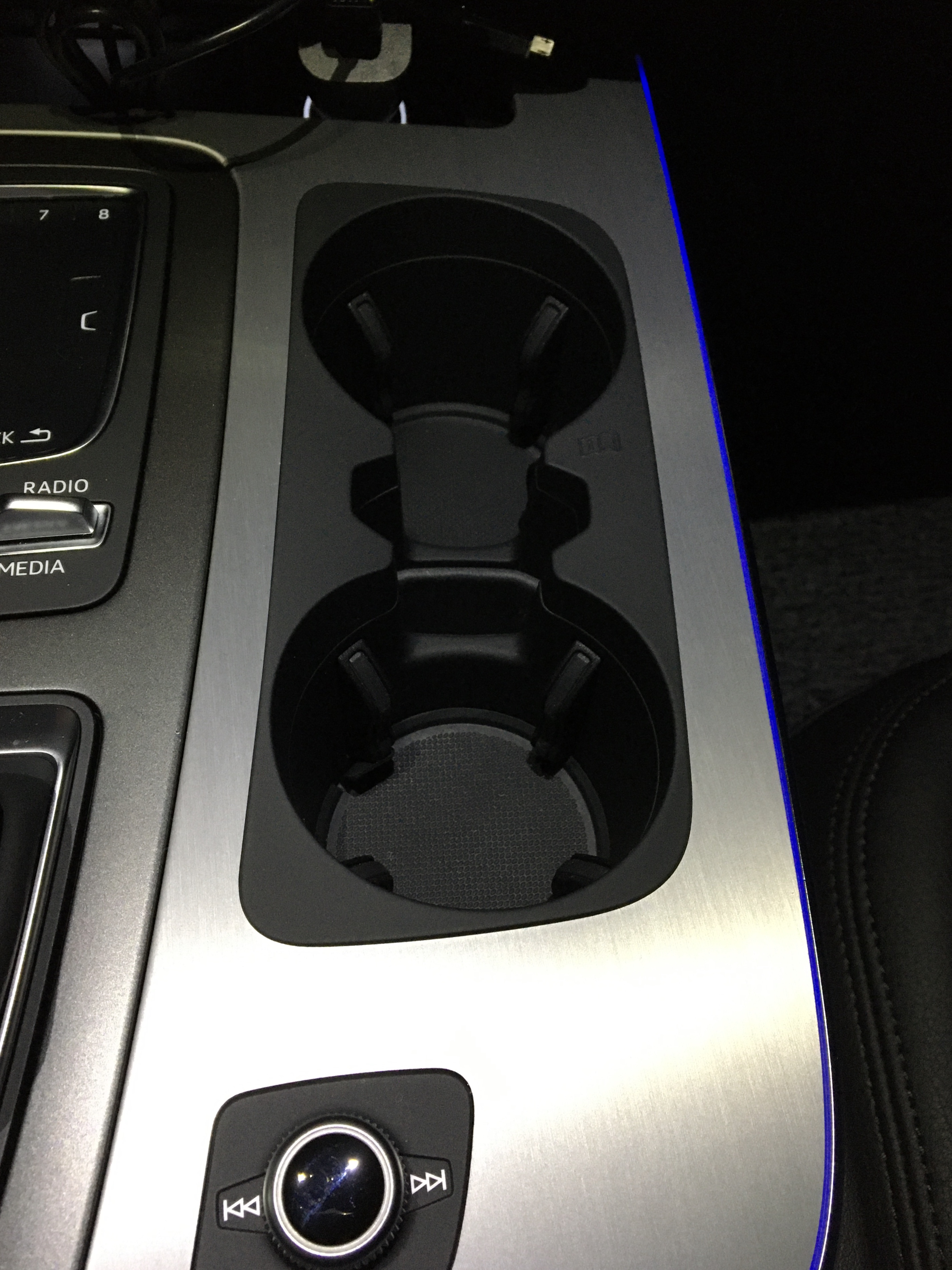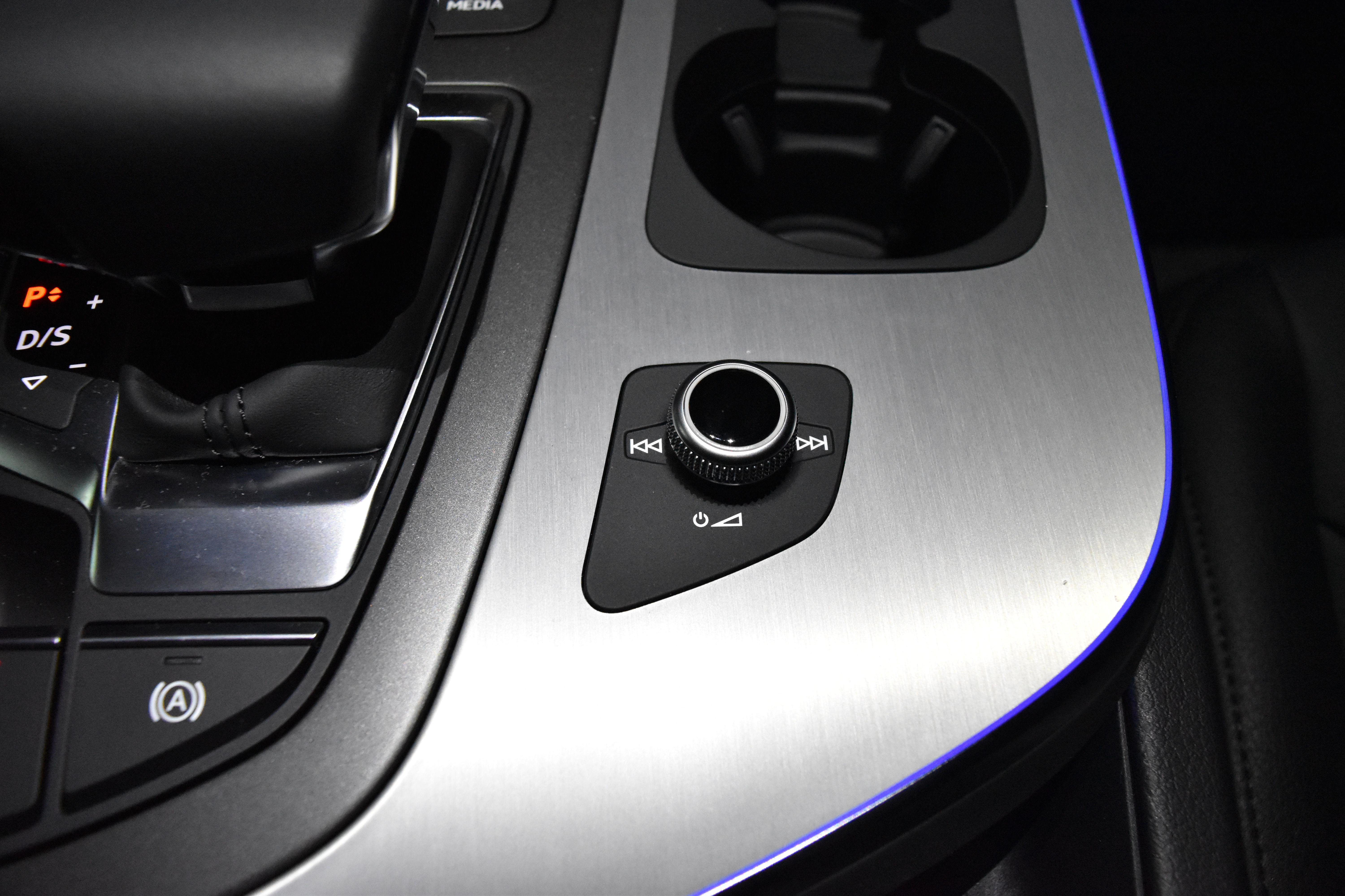 컵홀더 뒤쪽으로는 MMI 전원과 볼륨, 이전곡/다음곡을 컨트롤 할 수 있는 버튼이 있습니다.