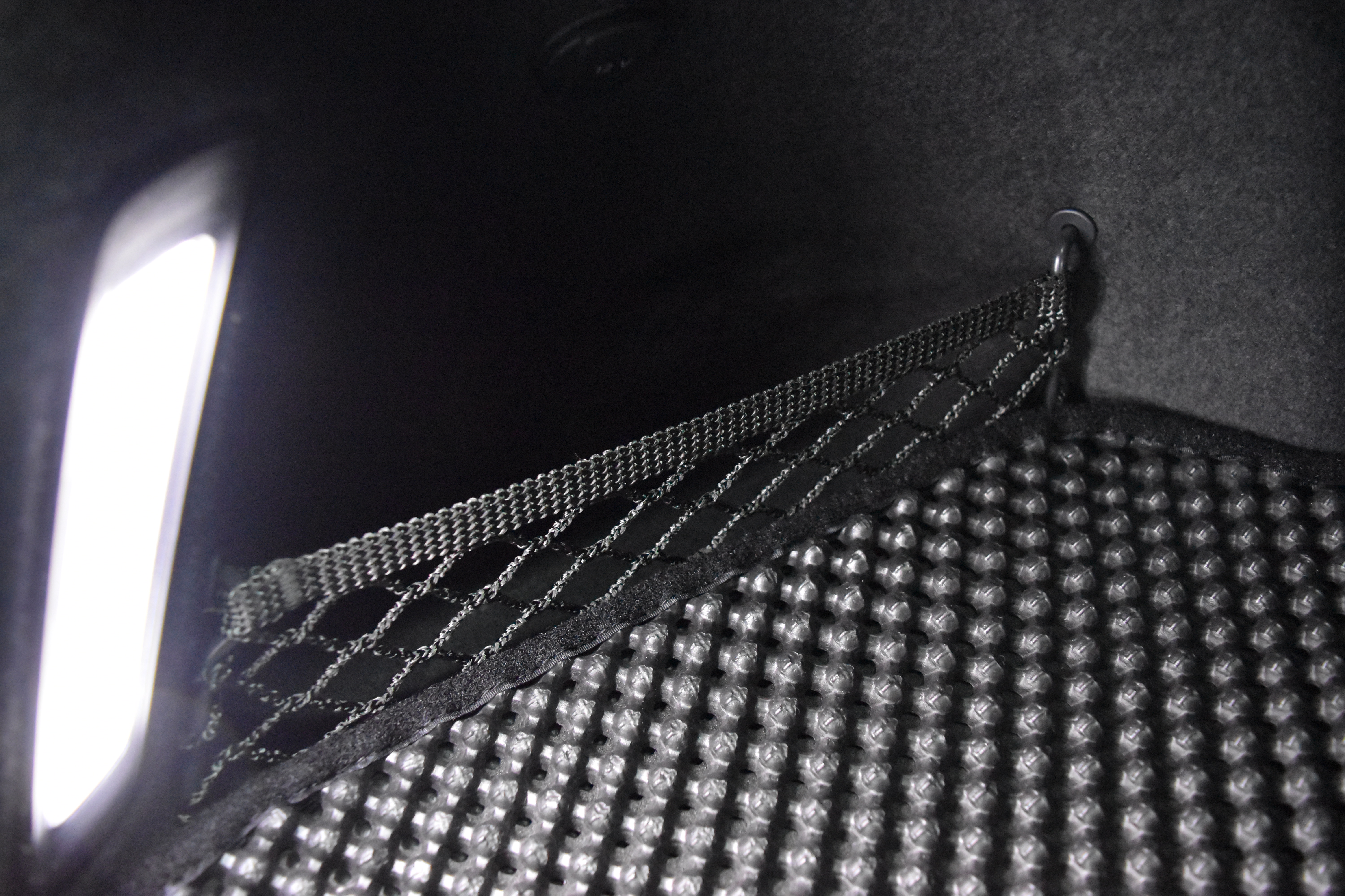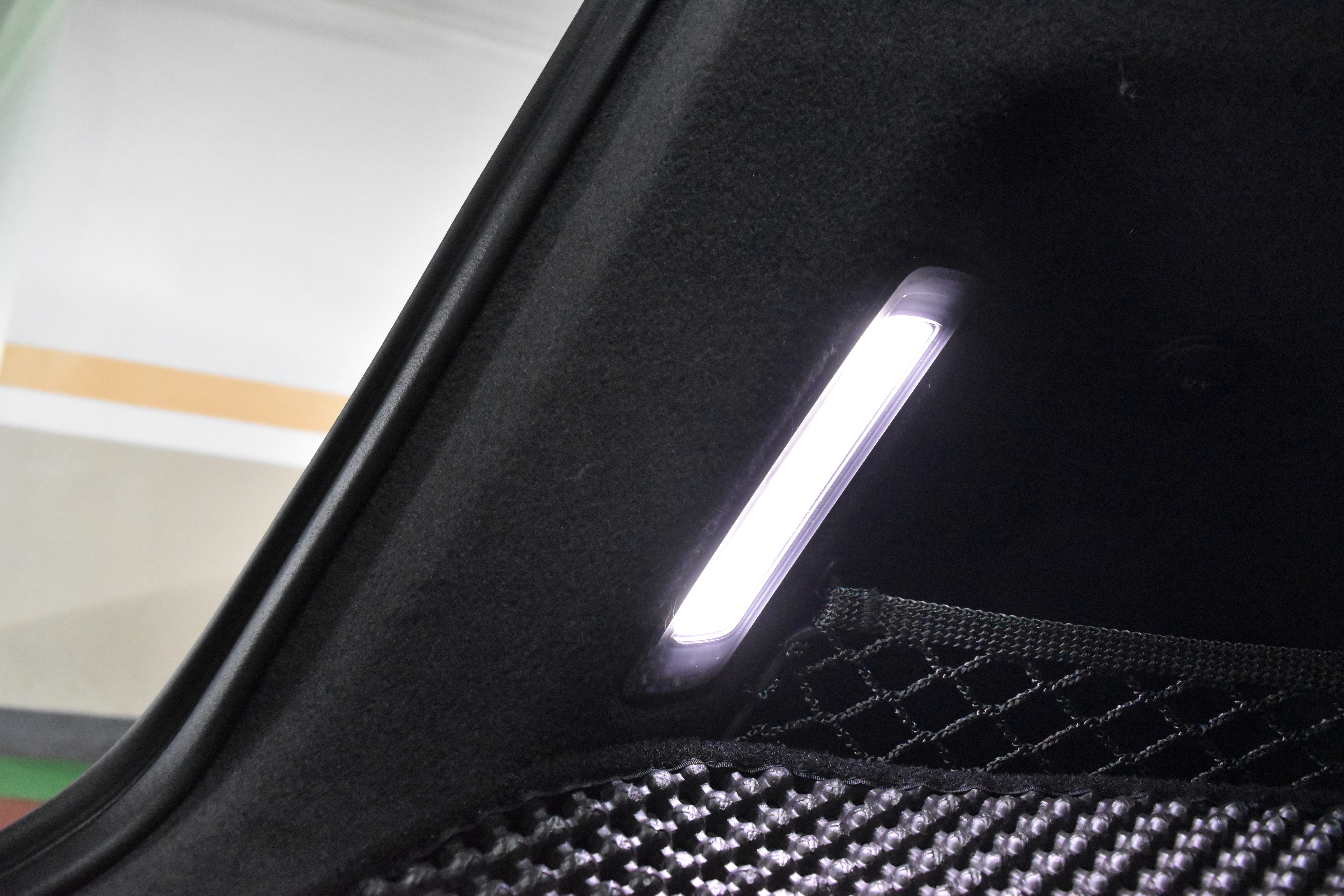 좌측 LED 등 옆쪽으로는 12V 소켓과 작은 물건을 수납할 수 있는 네트로 분리된 공간이 지리잡고 있습니다.