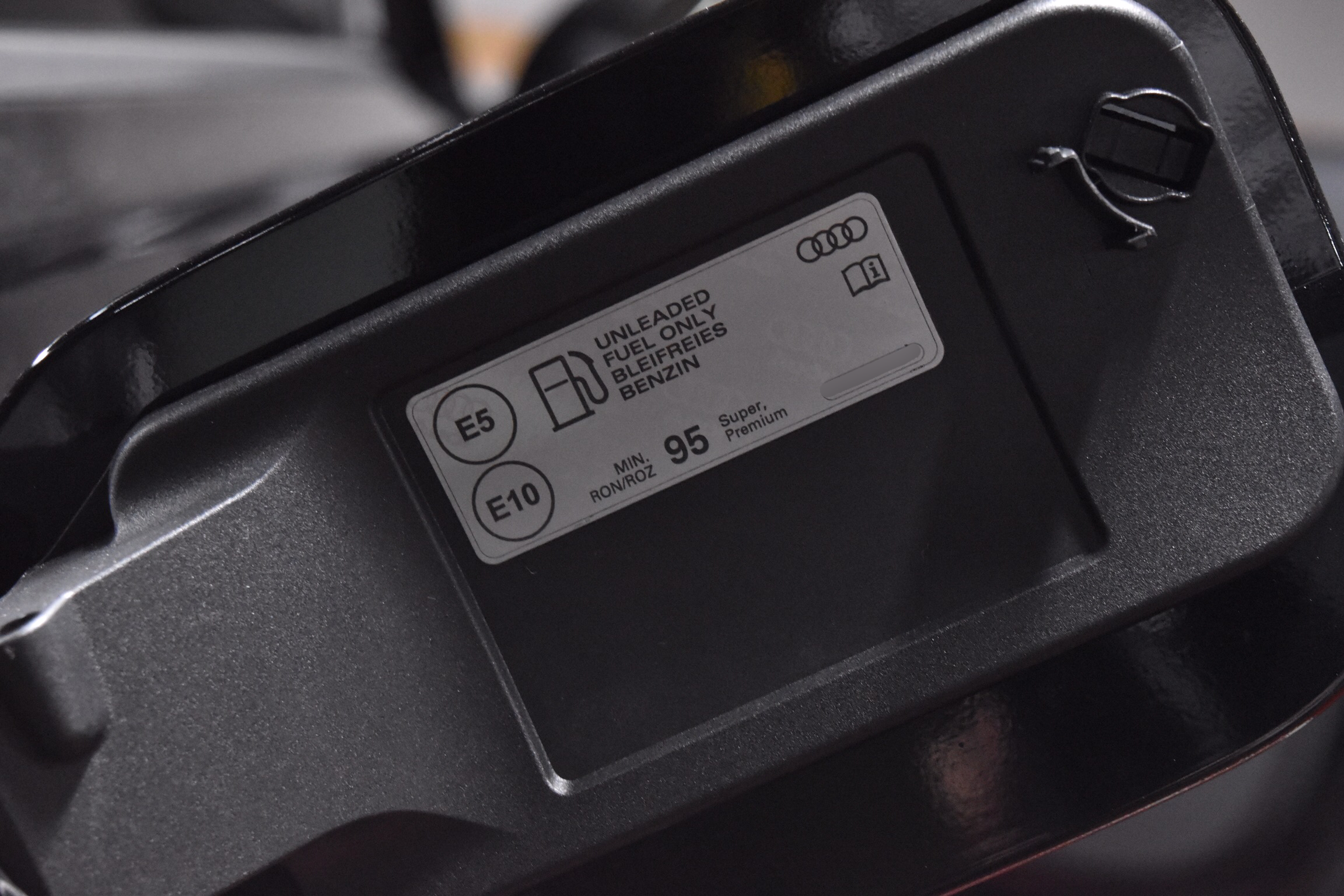 차량의 주유구 모습이며, TFSI 엔진 모델인 만큼 연료는 당연히 휘발유 입니다.